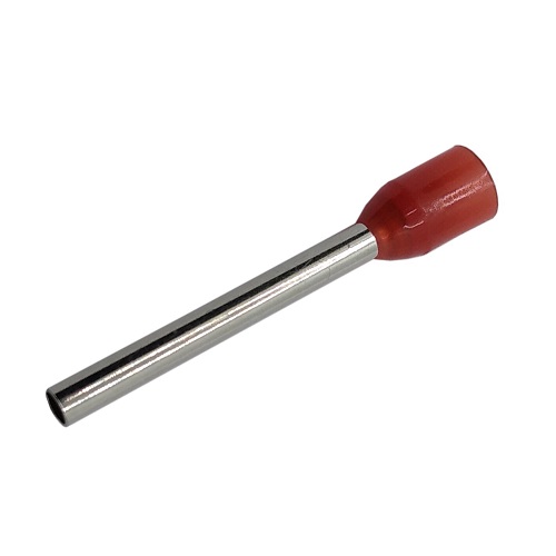 Insulated cord end terminal for flexible wire, red vinyl insulation.