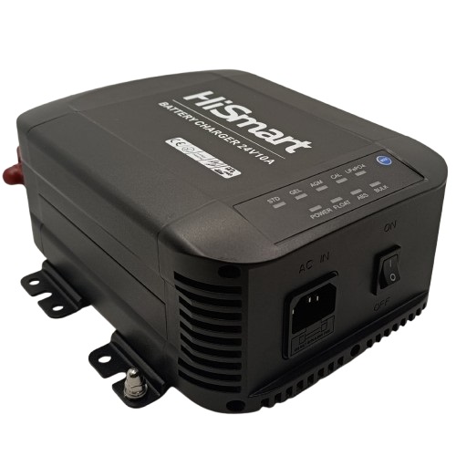 Automatic smart battery charger with an integrated charging management system for 24V lead-acid and LiFePO4 batteries. It is designed for charging and maintaining batteries used in various 24V systems. It automatically detects the battery’s condition and selects the appropriate charging mode. Features:Suitable for 24V batteries: can be used with various vehicles and devices.Supported battery types: lead-acid (STD, AGM, GEL, CAL), lithium iron phosphate (LiFePO4).Automatic charging: the device automatically adjusts the charging current and voltage level according to the battery’s condition.Automatic smart charging algorithm with a 3-stage charging mode: the charger first charges the battery with constant current, then with constant voltage, and finally switches to maintenance mode. This charging method ensures efficient and safe charging, reduces the risk of overcharging, and helps extend battery life.Battery type selection button allows convenient selection of the appropriate mode based on the battery being used.LED indication shows the selected battery type and the charger’s operating status.Maximum charging current is 10A, making the device suitable for both charging and battery maintenance.The package includes clamps for convenient connection to the battery.Integrated protections: reverse polarity, overvoltage, and overheating protection, so the charger safeguards both the battery and the device itself.A wide input voltage range allows the device to be used in various conditions.Easy to use. Simply connect the battery to the charger, select the appropriate battery type, and turn on the power – the device will carry out the charging process automatically.Compact design ensures convenient use and storage.Wide application: suitable for batteries in cars, motorcycles, boats, campers, security systems, and other 24V systems.Advantages: easy operation, automatic functionality, efficient charging, and extended battery lifespan.Specifications:Input voltage: 180-240V AC.Charging current (Imax): 10 A.Frequency: 47-63 Hz.Input current: 1.56 A.Output current: 0-10 A.Supported battery types: STD, AGM, GEL, CAL, LiFePO4.Charging voltage: 28.8 V (STD); 28.4 V (GEL); 30.0 V (CAL); 29.2 V (AGM); 29.2 V (LiFePO4).Float charging voltage: 26.8 V (STD); 26.4 V (GEL); 27.6 V (CAL); 27.2 V (AGM); (not applicable to LiFePO4).Standard boost charging voltage: 28.4 V ±0.2 V.Standard maintenance charging voltage: 27.6 V ±0.2 V.Display: LED.Efficiency (typical): 86%.Operating temperature: 0°C to +60°C.Operating humidity: 20–90% RH (non-condensing).Dimensions: 156 mm x 222 mm x 87 mm.Weight: ~1.5 kg.Color: black.